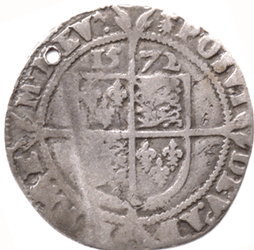 1572 Elizabeth I Sixpence - 3-4th issue - Small bust. Mintmark: Ermine. Small pin-hole at top. Ex-creased but now flattish, left side. Reasonable portrait. legend mostly clear both sides The coin is round and no real sign of clipping. Grade: Fine Axis slightly off centre
