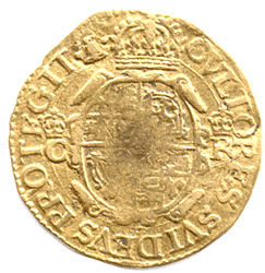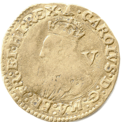 1634 -35 Charles I Gold Crown 4th Bust. Group D Mintmark: Bell Grade: Obv. Good round coin. Good clear legend. Portrait a bit weak. Fine+ Rev. Good clear legend. The dark mark in the centre is is in fact the opposite - CLEAR flatness ! Fine+ I am unable to scan or photograph the coin to show true likeness !!??