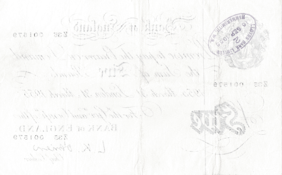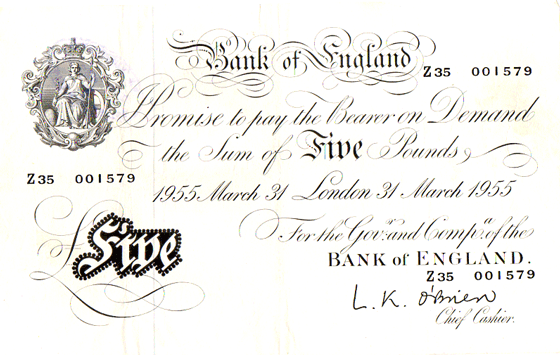 Date: 1955 March 31 Value: £5.00 No. Z35 001579 Signed: L. K. O'Brien Obv. Nice clean looking note. Appears flat without creases. When held to the light trace of crease from 12 o’clock to 6 o’clock. Rev. Slightly dirty mark, 12 o’clock to 6 o’clock from the note having been creased. A purple bank handstamp at top right corner – Lloyds Bank Ltd – 16 Sep. 1955 Hammersmith. When held to light an additional crease from 9 to 3 o’clock. Therefore at some stage the note had been folded in 4. Otherwise the note is reasonably clean with no tears or nicks. Grade: EF/EF?