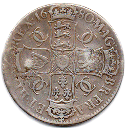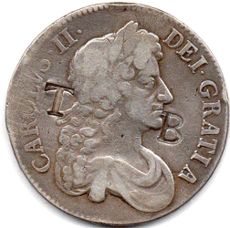 1680 Crown - 3rd bust Edge: TRICESIMO SECVNDO Obv. Good face features for Charles II with part of hair clear. Slight weakness to the legend strike at CAROLVS - top of OLV unclear. The initials 'T' & 'B' have been stamped either side of the bust. Rev. All four shields and internal motives clear. IB of HIB weak strike at top in exactly the same area as per the obverse ! Date: Clear. Grade: Difficult as Charles's head and the right side of the coin are Fine+ but the left side due to the weak strike makes the grade Fair ! The 'T' & 'B' has not improved the coin's appearance. Luckily they are in the field and not on the bust.