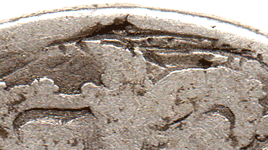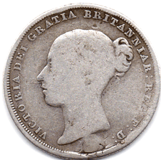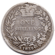 SH 1839 A shilling - 1st head type W.W. below bust Obv. Mark below bust & rim. 1st thought it was hole filled but is NOT as on the reverse there are scuff marks at rim area but the cross and crown show no trace of being holed !!? I am not sure what has occurred. Grade: Obv. Fair. Rev. Fine A scarce obverse for this date.