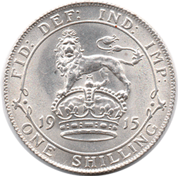 1915 Shilling - Obv. Fairly good head strike Obv.A fine hair-line shallow scuff from edge just after X of REX (at 5 o'clock) up to bust. Looks worse on picture than it is. Otherwise a nice coin Grade: EF+-pAS