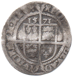 1571 Elizabeth I Sixpence - 3-4th issue - Small bust. M.m: Castle (rev.) Obv. Part of legend visible ELIZA & part faint outline of bust Rev. Most of legend clear. Shield & date strong. The coin is round. Slight ex-kink, now straightened. Axis: ↑→ Grade: Obv. Poor. Rev. Fair - Fine