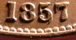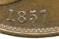 1857 Copper Penny (Type 1 & 4) - 10 bead spacing - Date: Style C The base of the 1 is lower than the other 3 numerals '857' The 7 has no down tooth at end of top bar. Note - The larger size border tooth is now central below 5