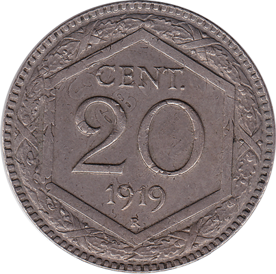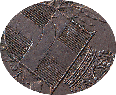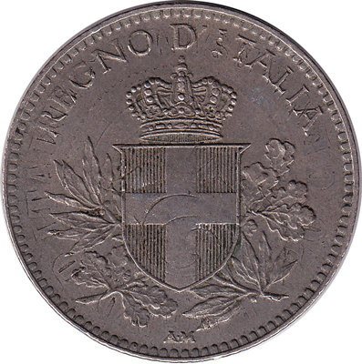 On the obverse the reverse of the 'old' coin shows through. In the centre is the large numeral 20. Below the numeral '20' - 20 CENTESIMI is partly visible and above the numeral '20' - D' ITALIA can also be clear seen.