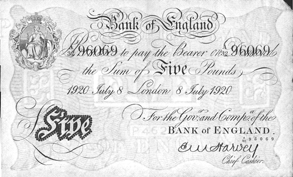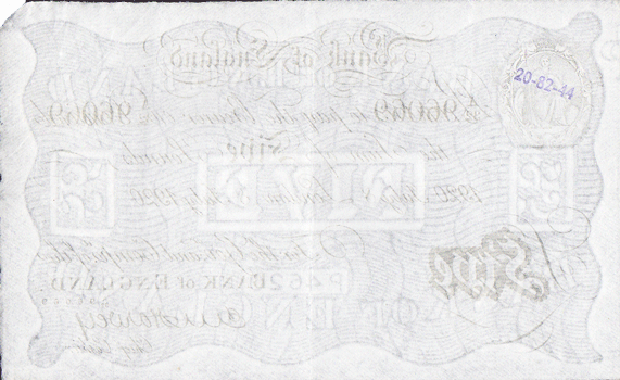 A/32 96069 Signed: E. M. Harvey Obv. The very smallest hint that the note might have been folded in half (down the centre). Rev. Bluish rubber stamp – top right (behind Britannia) ‘20-82-44’ Grade: EF+ a choice note (bar the bluish rubber stamp !)