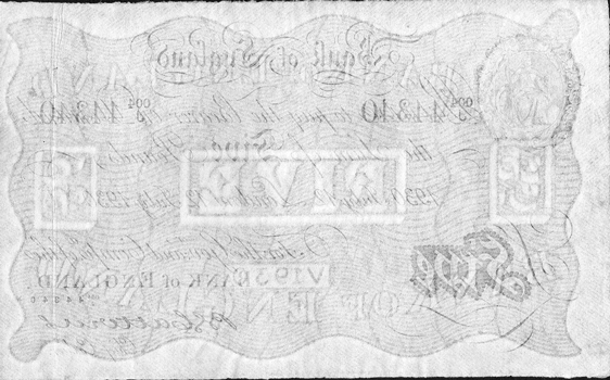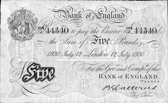 Date: 1930 July 12 Branch: London Value: £5.00 No. 004/J 44340 Signed: B. G. Catterns * One of the hoard notes sold of in June 2007 at London Coin Auctions Obv. Choice - just a hint of a crease along right edge from top edge to bottom - between 4 & 0 of 44340 Rev. Choice - slight crease as per obverse Grade: EF+