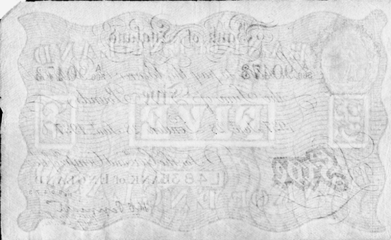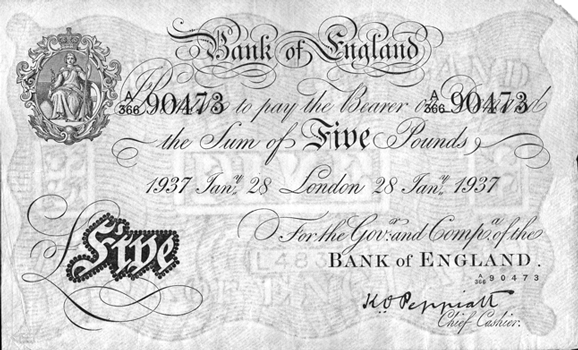 Date: 1937 January 28 Branch: London Value: £5.00 No. A/366 90473 Signed: K. O. Peppiatt Obv. Very slight 'grease' mark at bottom centre (Does not really show up on the scan !) Crease bottom left corner. Couple of pin-holes in centre of note !? Rev. Slight ‘yellowing - top right behind Britannia. Trace of centre crease. Grade: EF?