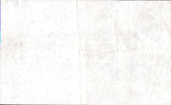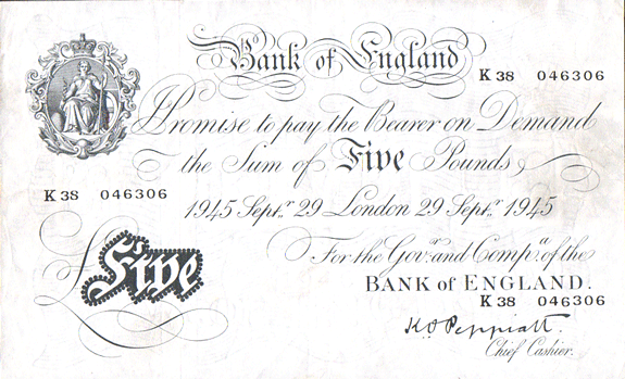 Date: 1945 September 29 Value: £5.00 No. K38 046306 - Thick paper & metal thread Signed: K. O. Peppiatt Obv. Reasonably clean. Rev. Slightly dirty - more so on right side. Dirty on crease line (12 to 6 o'clock) Fainter crease line (9 to 3 o'clock) Grade: EF?/Fine+