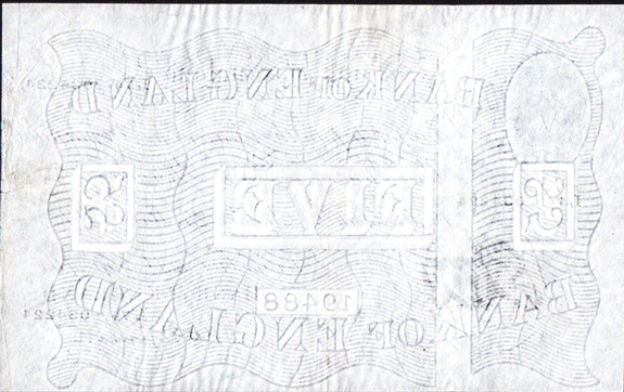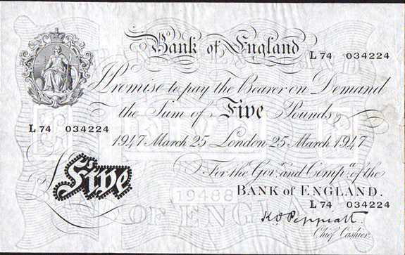 Date: 1947 March 25 Value: £5.00 No. L74 034224 - Thin paper & metal thread Signed: K. O. Peppiatt Obv. Very clean except for what could possibly be a grease mark at 3 o'clock - right edge On close examination there appears to be a couple of tiny edge nicks at 3 o'clock - right edge 1 nick - 1mm nick and 1 nick below - 3mm. Some very slight wrinkles along top and bottom edges. Rev. Possible centre line pressing along vertical centre line (12 to 6 o'clock). Nicks at left edge as seen on obverse. Grade: Other than the tiny nick at right the banknote is overall probably EF-EF+