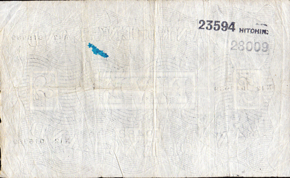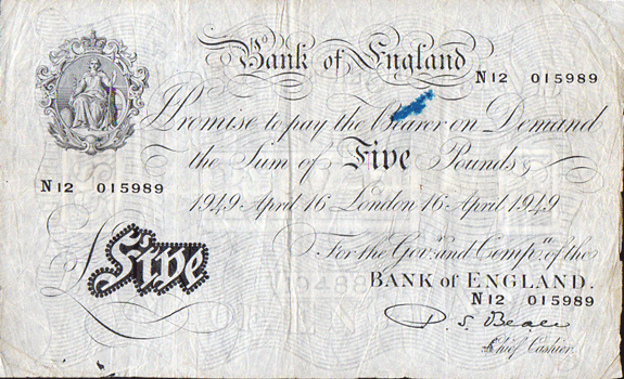 Date: 1949 April 16 Value: £5.00 No. N12 015989 Signed: P. S. Beale Obv. Blue ink mark just above 'Bearer'. Creased down & across centre. Slightly frayed on right edge. Rev. Slightly dirtier at top left quarter. Blue ink mark shows through. In black ink '23594 Hitchin' & 23009