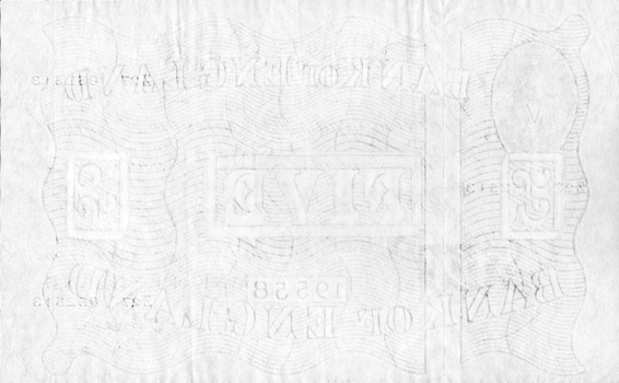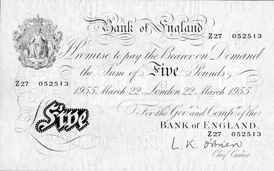 Date: 1955 March 22 Value: £5.00 No. Z27 052513 Signed: L. K. O'Brien Obv. Clean front. Very slight ripple along top & bottom edge. Rev.