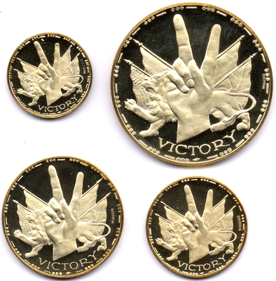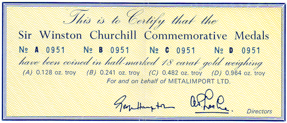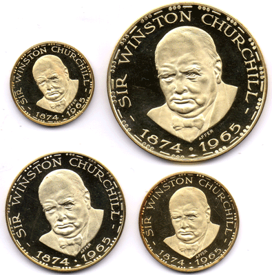 A set of 4 x 18 carat gold medallion issued in 1965 on the death of Sir Winston Churchill Obv. Bust of Sir Winston Churchill Rev. Winston's famous 2 finger "Victory salute" with British lion & 4 flags Weight = 57.8 grams or 1.858 ounces. (1.3938 AGW)