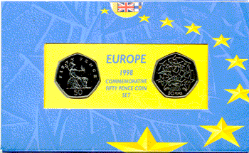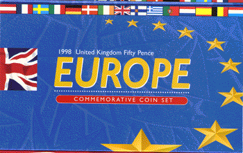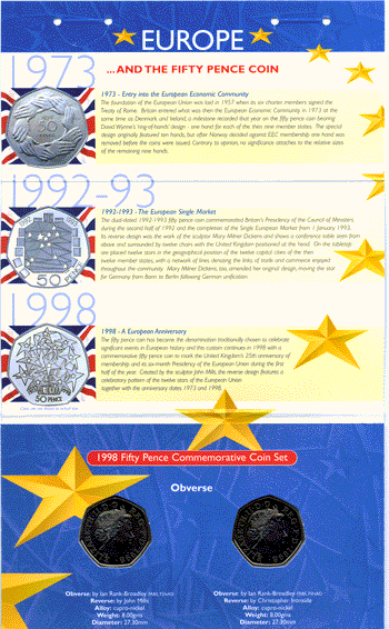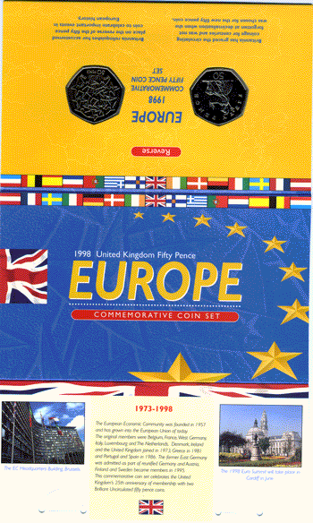 1998 Double pack / folder of 50p's - Britannia & EU commemorative - open