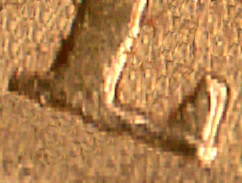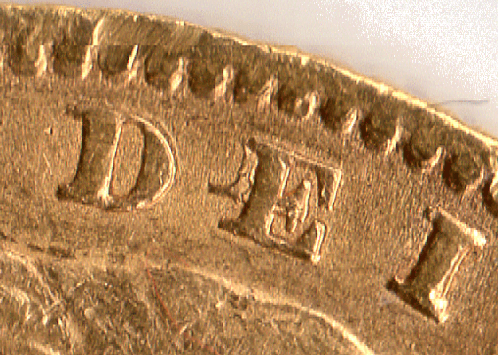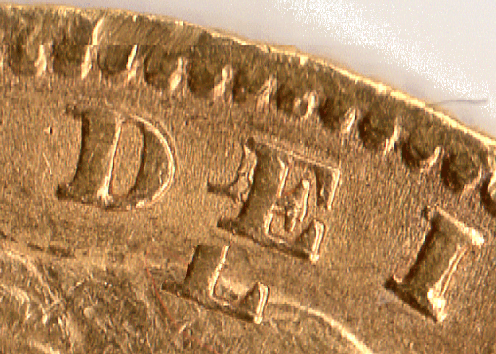 An interesting repair to an 1861 Shield back sovereign. The DEI has been repaired or strengthened but the repair to the E has gone slightly wrong. The D & I only show slight traces of doubling.