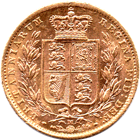 1872 Sovereign - shield-back Melbourne Mint (Small 'M' below wreath tie - 6 o'clock) Obv. Die crack (12 o'clock) From rim thru D of DEI onto Victoria hair to just below lower hair-ribbon. Grade: A really nice EF coin the reverse possibly even better.