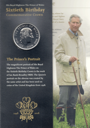 The £5 coin for Prince Charles's 60th birthday in a presentation pack. See price and availability on our £5 (non gold) list