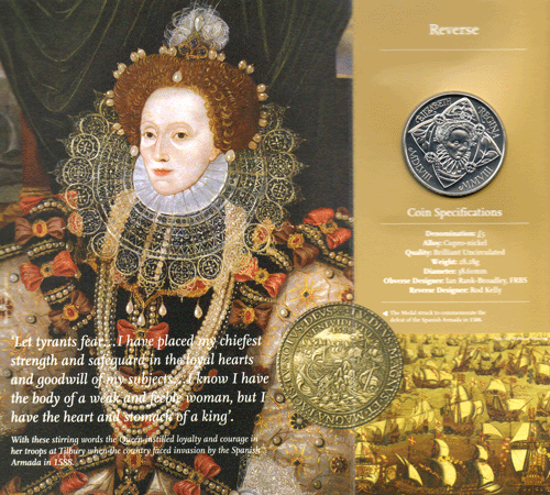The £5 coin for the 450th anniversary of the accession of Queen Elizabeth I, to the throne. in a presentation pack. The £5 is shown separately, on the right. See price and availability on our £5 (non gold) list