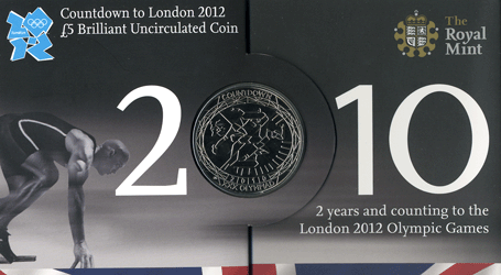 2010 £5 coin in Royal Mint Presentation pack of issue 2nd coin in series of the Countdown to London Olympics 2012 Coin shows two runners and a large 2 in the centre (2 years to go !) Price..............see £5's