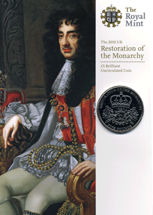 2010 £5 coin in Royal Mint Presentation pack of issue For: The Restoration of the Monarchy (350th Anniversary - [1660])