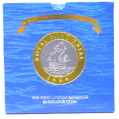 In 1994, The Royal Mint experimented with a bimetallic Two Pound coin, with the intention of releasing a version into circulating coinage. A version of this coin was subsequently released into general circulation in 1997 and became the first ever bi-metallic British coin issued. In 1998, the Mint released 4,500 of these 1994 trial £2 pattern coins to the general public. However, they are not legal tender due to the fact they were not officially authorised to be released as currency, hence the absence of a face value and the “pattern” description. These pattern coins are housed in an informative slip case which details the production method used in their manufacture. The reverse of the coin shows an unnamed galleon, and is similar to the ship as seen on halfpenny coins dated between 1937 and 1967.