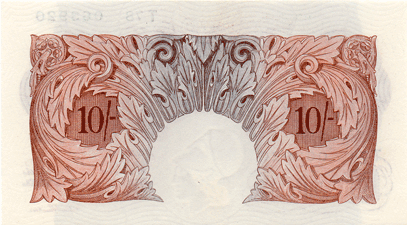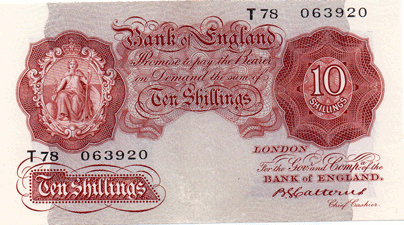 1930 Catterns - 10 Shillings - B223. Mid series T~~ (T78) Obv. There are some tiny white 'wiggles' on lower left side of the central watermark. As to what these 'wiggles' are ? - I have no idea. Did it happen during printing ?? Both sides appear to be Choice & crisp AUNC.