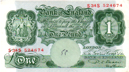 1950 Beale - 1 Pound. Ref: B269 - Replacement issue S34S 524674 Obv.. 55 or 53 in lower centre in navy blue ink or biro Rev. Faint bleed of 55 or 53 in lower centre Grade: EF+ A nice clean note. (Some might grade as AUNC). Shame about the number !