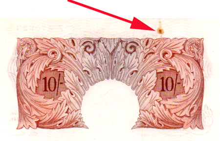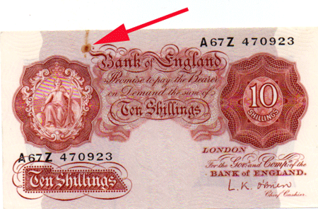 1955 O'Brien 10 Shillings - 1st issue issue - A67Z 470923 Obv. A small rust mark at top edge, left side - Possibly ex a damp paper clip !? Shown with a red arrow. Rev. A small rust mark at top edge, right side - Possibly ex a damp paper clip !? Shown with a red arrow. Grade: AUNC - I cannot find any trace of a crease. Just same about the rust mark !
