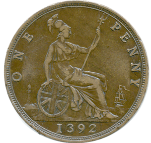 This unusual penny was probably 'date altered' in late Victorian or Edwardian times. The workmanship is fairly good but on close examination it is possible to see where the 8 has been altered into this 3. Why 1392 ? - there appears to be nothing memorable about the year. Was it just a case that the person wanted to see what he could do with a bit of careful carving !?