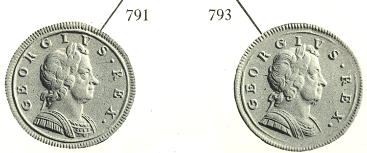 1719 Halfpence (Obv. 2) [P.791] 1719 Halfpence (Obv. 3) [P.973] Left shoulder - 3 lines (centre dashed) Left shoulder - 2 plain lines only Top of breast plate - straightish Top of breast plate - curved Centre medal at base of plate NO medal at base of plate