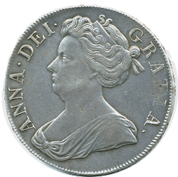 1707 Crown - 2nd bust - Edge: SEPTIMO - Rev. plain in angles. Obv. The 'TI' of GRATIA is weakly struck Rev. Tiny flaw in metal in lower left quarter (NOT a dig !). Grade: EF Pale grey.Te coin is lightly toned with no edge nick or marks - Nice coin !