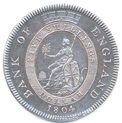 1804 Bank of England dollar. C + 2b (D. 6) - Scarce Obv. Small scratch just on chin Rev. Inverted, reversed K to left of shield. Grade: EF Obv. Not as dark as the pictures makes out - Greyish blue around legend otherwise bright possibly ex polished !? Rev. Blueish grey up to shield garter - slightly lighter in centre. Over all quite a pleasant coin.