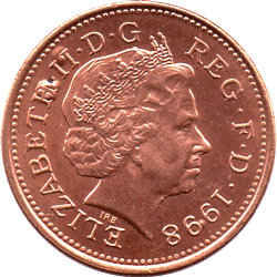 1998 decimal penny with several "air bubbles" in the metal. Obv. Below H of ELIZABETH and below the 2nd "I" of II. Also between 19.98 of date. Listed as OP 1998 C - AU90. A couple of tiny ex-carbon spots on cheek and on bubble