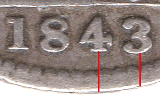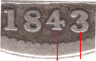 1843 Date varieties All of the 1843 groats have the 18 of the date in a fixed position. The position of the 43 can vary slightly. Date: The top of the 4 is pointed and has a T bar tail.