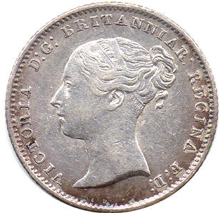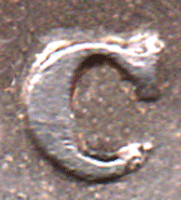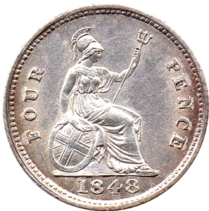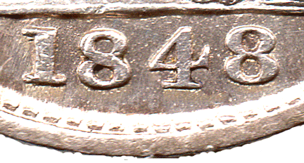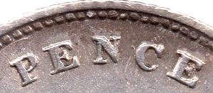 GR 1848 Bb - Obv. Ghosting to the right of Victoria's head Clashed dies - with rev. shield showing through. Rev. Type B The C of PENCE has part of the lower curve to tip broken off - leaving an open C. * A normal C has been shown so that one can see the difference. Date: Type b Large 4 - with a slant-up tail. 1st 8 is very slightly double struck. The 2nd 8 is also now large. The '148' are on the base line the 2nd 8 is entered ABOVE the 'base line'. Grade: Obv. EF? Rev. EF Bright