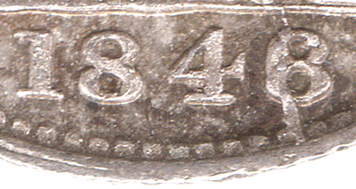 GR 1848 Bf - Date: Type f Last 8 over a 6 or 6 over 8. Always with the Large 4. This is an unusual over-date to identify as the usual protocol is for the date is that the upper most or is most prominent to be called the prime numeral over the other numeral below. In this case the 6 is just above the 8 but it is accepted that these coins were struck in 1848 but the Royal Mint was using up remainder dies from 1846. Normally the 8 is more heavily struck and covers the 6 and is more prominent. However, in this case, the top of the 6 is above the 8. The back of the 6 is also very clear and is above or at the same level as the left side of the 8. The lower central circle in the 6 is more up-right and oval. The lower central circle in the 8 is more circular than that of of the 8 The outer lower circle in the 6 is circular. The outer lower circle of the 8 is horizontally more oval that the 6. Also slightly wider.
