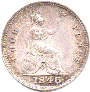 GR 1848 Bf - Rev. Type B The C of PENCE has part of the lower curve to tip broken off - leaving an open C. Fine hair-line die crack at 2 o'clock from edge into the left top corner of E of PENCE. Fine hair-line die-crack at 9 o'clock from edge into top right of O of FOUR.