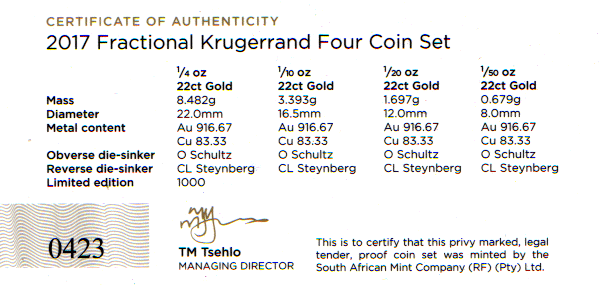 This South African Krugerrand 4 coin gold proof set was made in 2017 to commemorate 50 years of the Krugerrand. 1000 sets were issued (SOLD OUT at the time of issue - this is set is number 423. [0.420 AGW] As listed above the set contains 1/4 oz; 1/10th oz; 1/20th oz & 1/50th oz Each coin includes a special privy mark - A scarce set