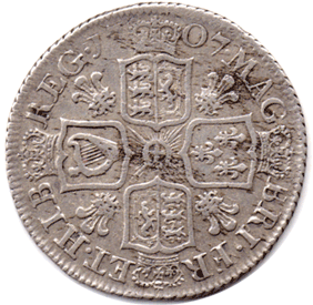 1707 Shilling Obv. 3rd bust (London Mint - After Union with Scotland)