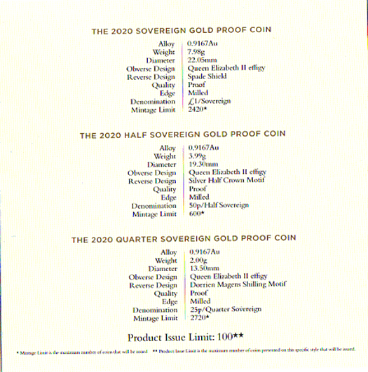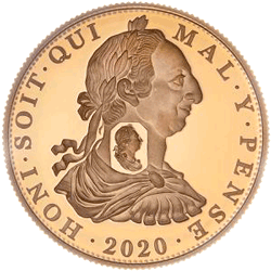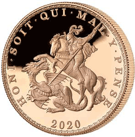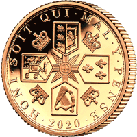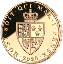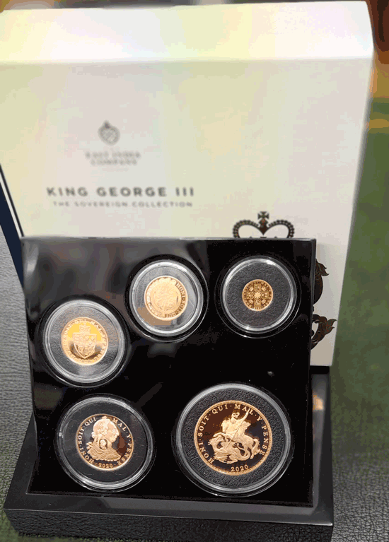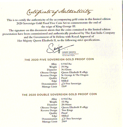 This is a set of 5 gold coins issued for Saint Helena in 2020. Issued by 'The East India Company' to commemorate the 200th anniversary of Gold Sovereign type coins issues in the reign of George III. All coins are issued as proofs in 22 carat gold.