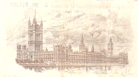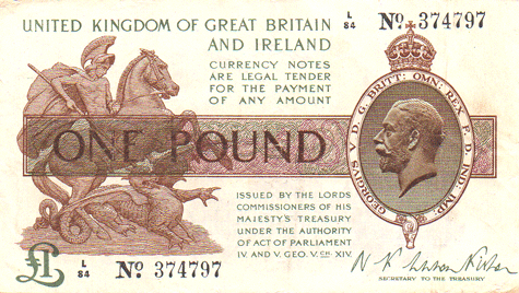 1919 Fisher - 1 Pound. Ref: T24 - 1st issue - 1st type (No.) Black numbers. Dot below o of No● L/84 N0. 374797 Mid series Grade: Obv. Clean . When held to the light - slight creases. EF Rev.. Clean. Slight trace of creases that the note might have been folded in 4 or 8 at some stage. Otherwise EF?-EF