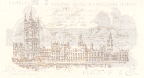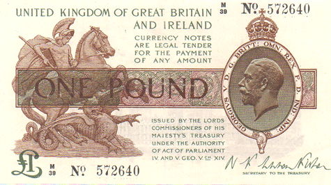 1919 Fisher - 1 Pound. Ref: T24 - 1st issue - 1st type (No.) Black numbers. Dot below o of No● M/39 N0. 572640 Mid series Grade: Obv. Choice, clean. Slight trace of centre crease when held to the light. EF+ Rev.. Choice, clean - Slight trace of centre crease when held to the light. EF+