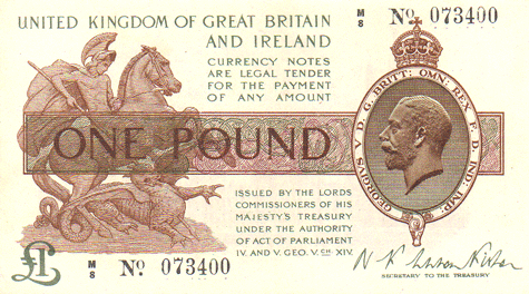 1919 Fisher - 1 Pound. Ref: T24 - 1st issue - 1st type (No.) Black numbers. Dot below o of No● M/8 N0. 073400 Mid series Grade: Obv. Choice, clean AUNC Rev.. Choice, clean - A very slight trace that the note might have been folded in 4 at some stage - only noticeable by holding it at angle in sunlight. Otherwise EF+