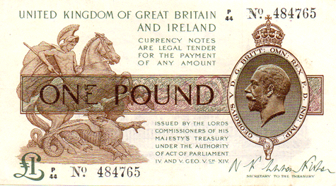 1919 Fisher - 1 Pound. Ref: T24 - 1st issue - 1st type (No.) Black numbers. Dot below o of No● P/44 N0. 484765 Mid series Grade: Obv. Choice, clean AUNC Rev.. Choice, clean - A very slight hint that the note might have been folded at some stage - only noticeable by holding it at angle in sunlight. Otherwise AUNC