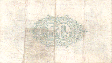 1919 Fisher - 10 Shillings. Ref: T26 - 1st issue - 2nd type (No.) Red numbers. dash below o of No▬ (Red dash) D/15 No▬ 49683 Grade: Obv. Cleanish. Central crease 12 to 6 o'clock. Pin holes. VF Rev. Folded at some stage in 8 squares. Dirt lines in creases and on the bottom half of the note the 2nd 'square' from the left is dirty !