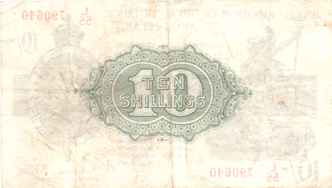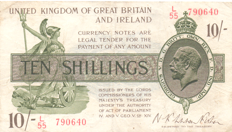 1922 Fisher - 10 Shillings. Ref: T30 - 2nd issue - Red numbers. No (Omitted) L/55 790640 (Mid series) Grade: Obv. Clean & flat. Trace of light creases. VF+-EF? Rev. Creased in 4 from top to bottom. Centre crease from side to side, Ex folded into a small square of 8. Slightly dirty Fine