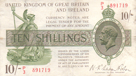 1922 Fisher - 10 Shillings. Ref: T30 - 2nd issue - Red numbers. No (Omitted) P/3 891719 (Mid series) Grade: Obv. Slightly dirty - flat. Traces of creases. Appearance VF or VF+ Rev. Dirty at right half. Creased in 3 from top to bottom. 1 crease from side to side, Ex folded into a small square of 8. POOR !