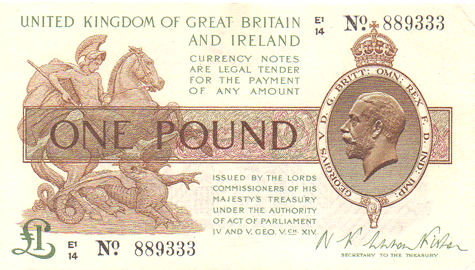 1923 Fisher - 1 Pound. Ref: T31 - 2nd issue - 1st type (No.) Black numbers. Dot below o of No● E1/14 N0. 889333 Mid series Grade: Obv. Clean. Tiny edge crease - top right corner otherwise. EF+ Rev. Clean. Hint of crease - top left corner. AUNC