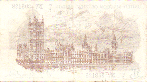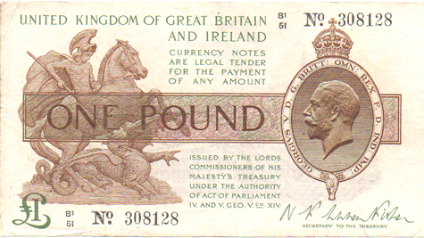 1923 Fisher - 1 Pound. Ref: T31 - 2nd issue - 1st type (No.) Black numbers. Dot below o of No● B1/51 N0. 308128 Mid series Grade: Obv. Cleanish. EF Rev. Not as clean as the obverse. Crease marks of having been folded with centre vertical crease and other ceases to left and right. VF