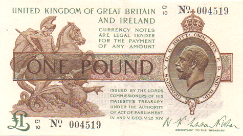 1923 Fisher - 1 Pound. Ref: T31 - 2nd issue - 1st type (No.) Black numbers. Dot below o of No● C1/10 N0. 199339 Mid series Grade: Obv. Choice Clean. Centre crease when held to the light. EF-EF+ Rev. Choice Clean Centre crease when held to the light. EF
